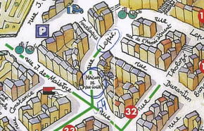 を訪ね歩きました。下の地図右側の拡大図のrue Le Pic 通り添いの右側が偶数番地(インフォメーション・センターの方が青いボール・ペンで54と書いてくれています)。ということはカール・ラーションが住んでいたのは、その真向いの建物ということだと思います。